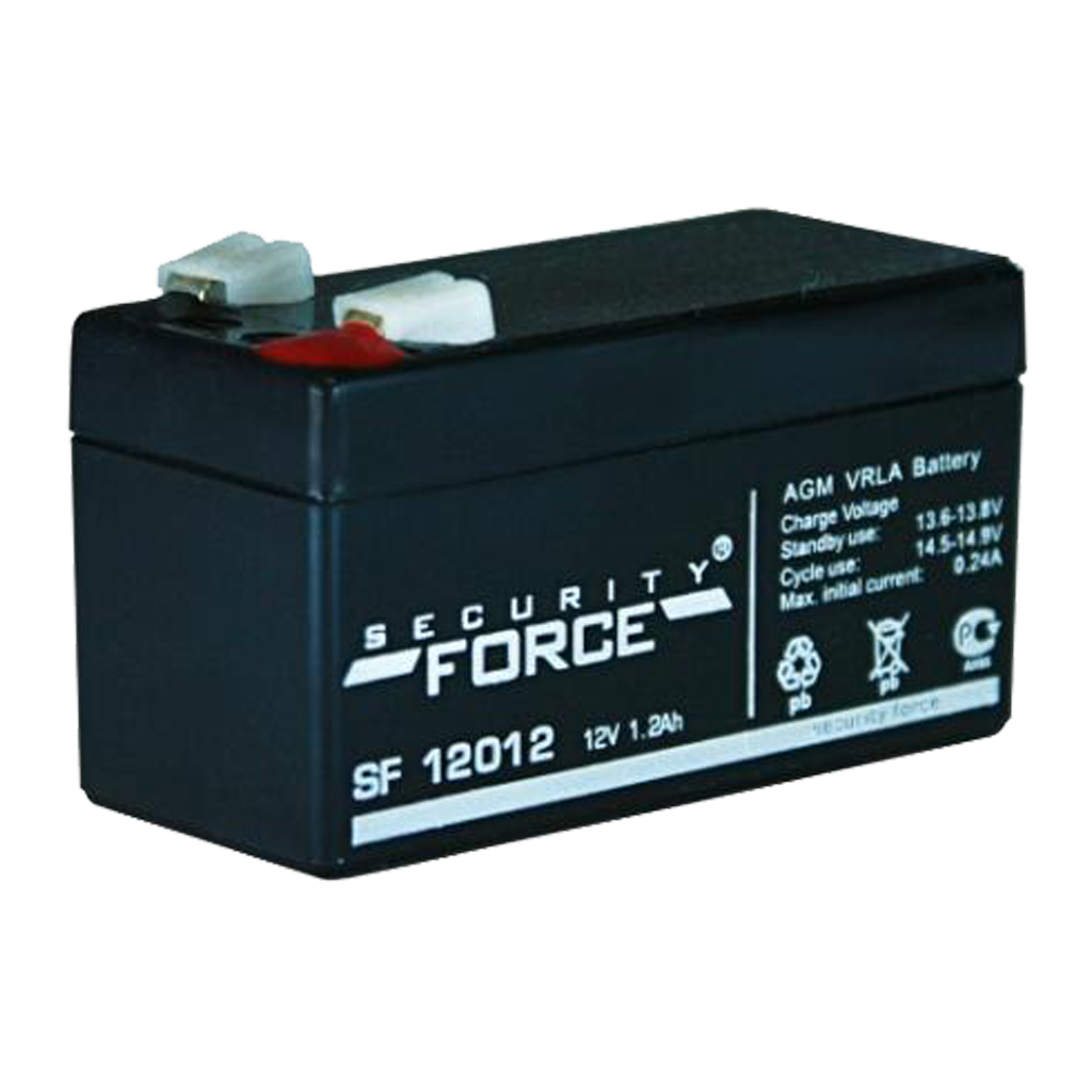 Аккумулятор SF 12012, Security Force, стационарный свинцово-кислотный, Емкость аккумулятора: 1,2 Ач, Номинальное напряжение: 12 В, Хранение: -20... 50°C, Заряд: -10... 50°C, Разряд: -15... 50°C, Размеры: 97х43х58 мм