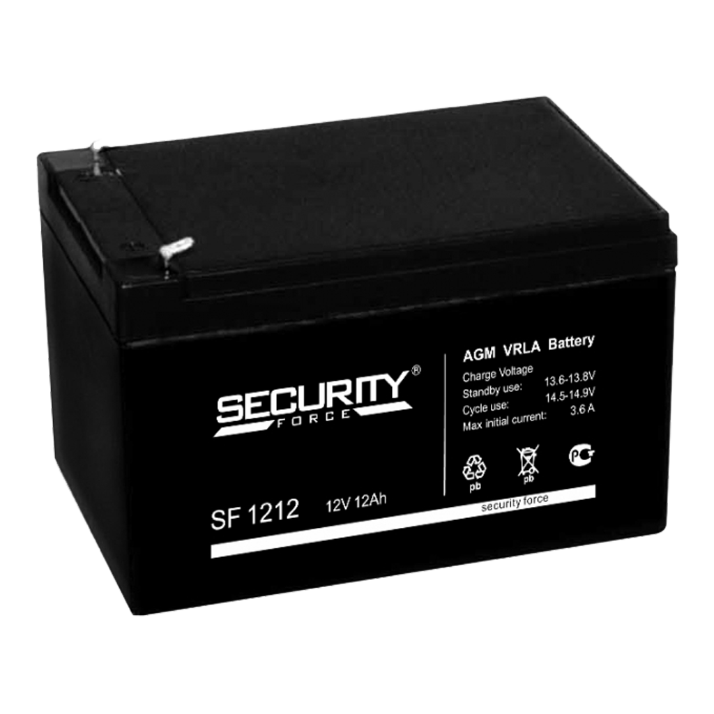 Аккумулятор SF 1212, Security Force, стационарный свинцово-кислотный, Емкость аккумулятора: 12 Ач, Номинальное напряжение: 12 В, Хранение: -20... 50°C, Заряд: -10... 50°C, Разряд: -15... 50°C, Размеры: 151х98х101 мм