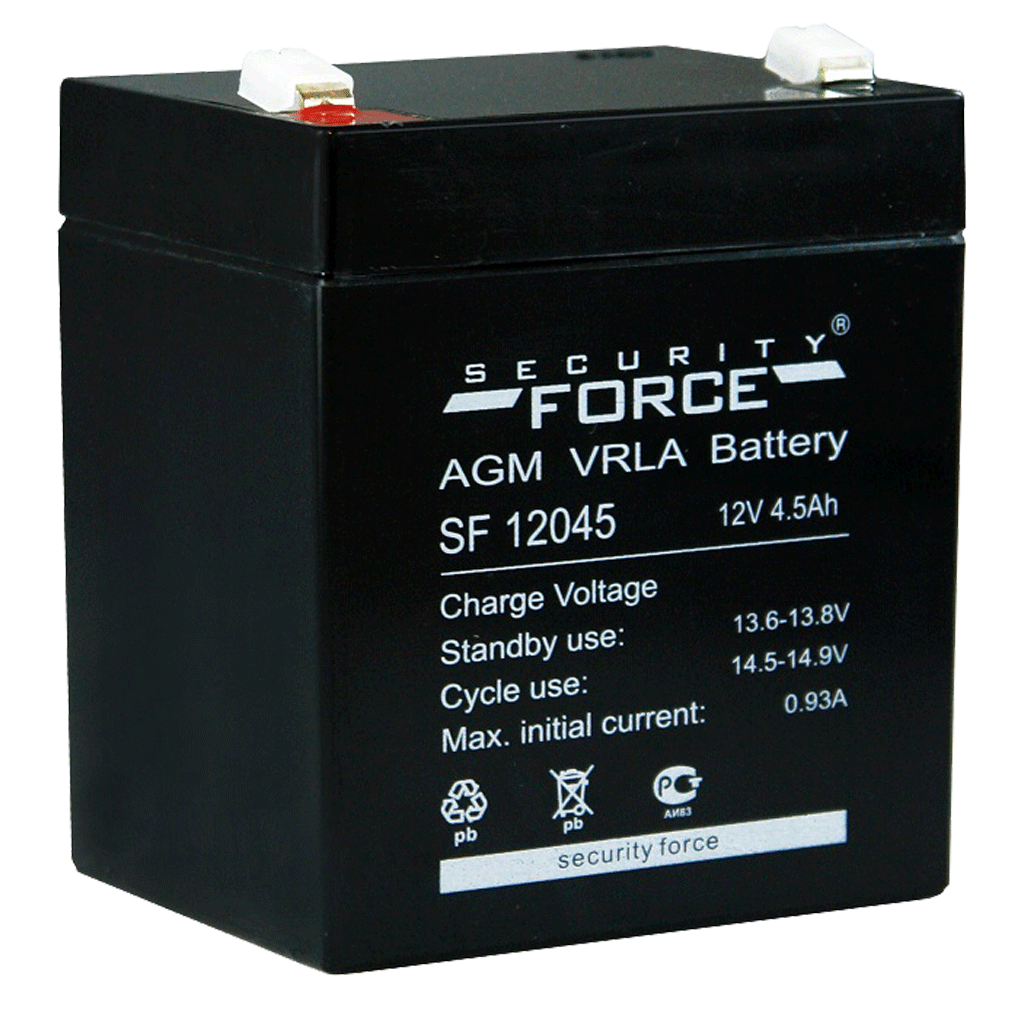Аккумулятор SF 12045, Security Force, стационарный свинцово-кислотный, Емкость аккумулятора: 4,5 Ач, Номинальное напряжение: 12 В, Хранение: -20... 50°C, Заряд: -10... 50°C, Разряд: -15... 50°C, Размеры: 90х70х107 мм